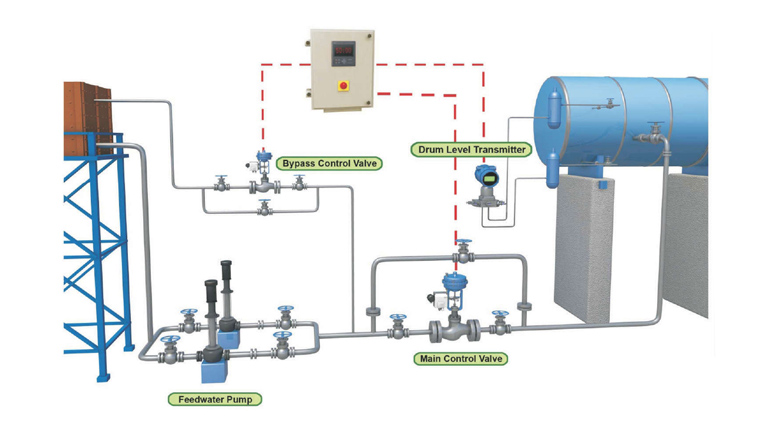 Boiler feedwater pump delivers water through control valve into the boiler drum. The water level in